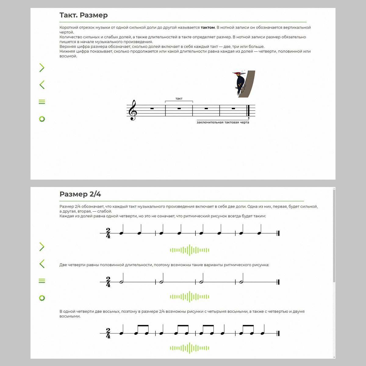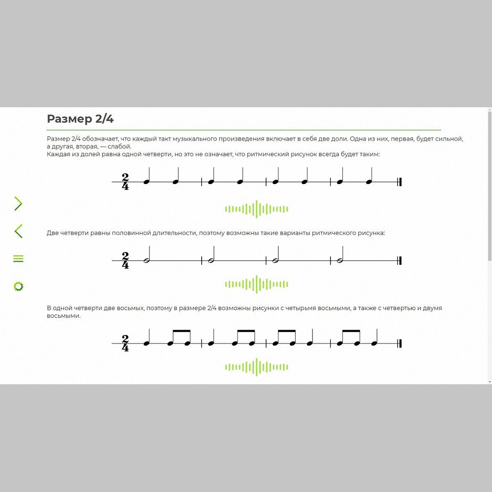 С помощью данного приложения можно освоить фундаментальные понятия, относящиеся к области метроритма (длительность, акцент, такт, простые размеры 2/4 и 3/4), выполнить различные виды интерактивных упражнений. Предусмотрено тестирование двух уровней сложности, а также представлены озвученные партитуры для музицирования на элементарных инструментах.
