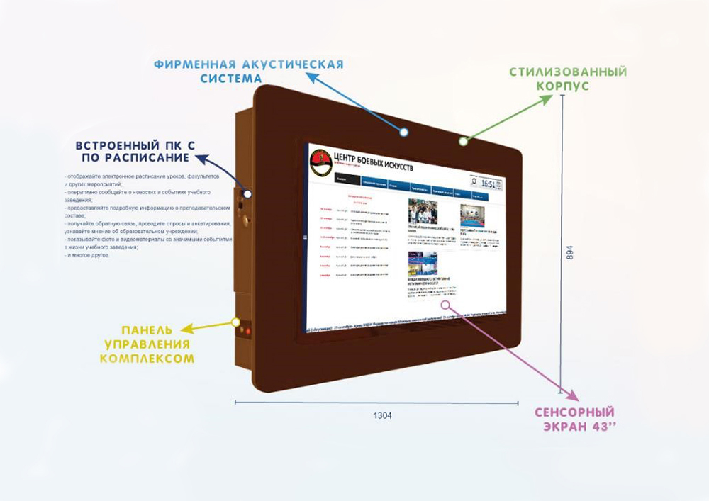 - на управляющем ПК находится предустановленное ПО «Расписание», которое заполняет методист, вносит правки, выкладывает новости и объявления;