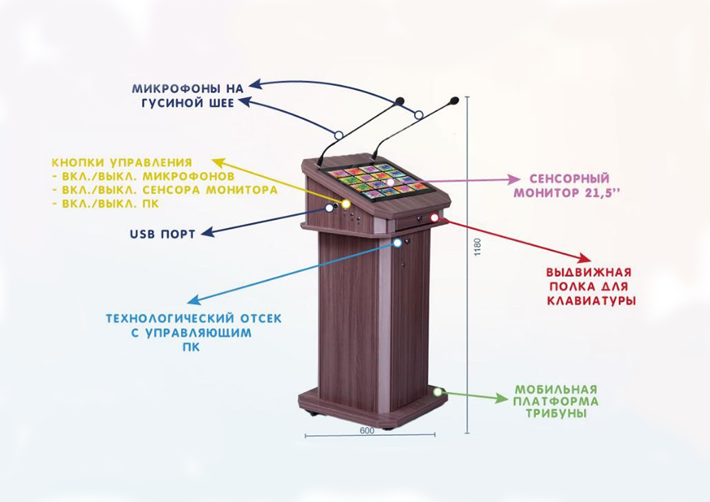 Интерактивная мультимедийная трибуна удобна для выступлений лекторов и докладчиков. Управлять трибуной вы можете с помощью встроенного мощного компьютера, работающего на операционной системе Windows 10. Сенсорный экран ПК имеет широкую диагональ – 21,5.