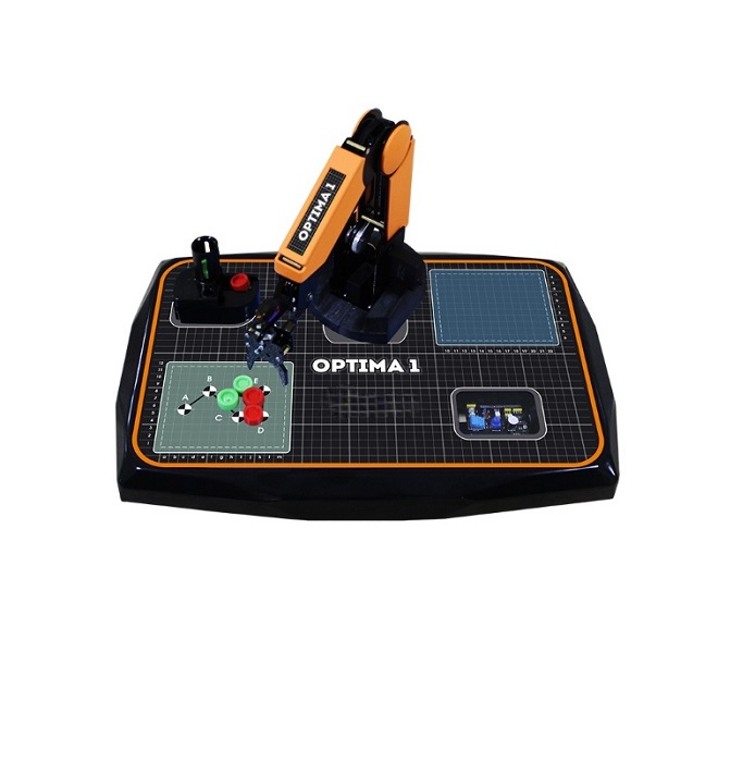 Учебный манипулятор Оптима-1 – образовательный комплекс, предназначенный для обучения учащихся программированию микроконтроллеров, алгоритмизации процессов и основам кинематики. Манипулятор выполнен на базе микроконтроллера Arduino Uno – одном из самых популярных на сегодняшний день. Робототехнический комплекс оснащен манипулятором с тремя степенями свободы и механическим схватом, раздатчиком шайб с датчиком цвета и большим кол-вом вспомогательных датчиков и устройств. По желанию заказчика робот может быть оснащен вакуумным захватом (присоской). Комплекс смонтирован на специальном столе с нанесенной разметкой и цветовым маркированием зон для решения практических задач по перемещению заготовок-шайб.