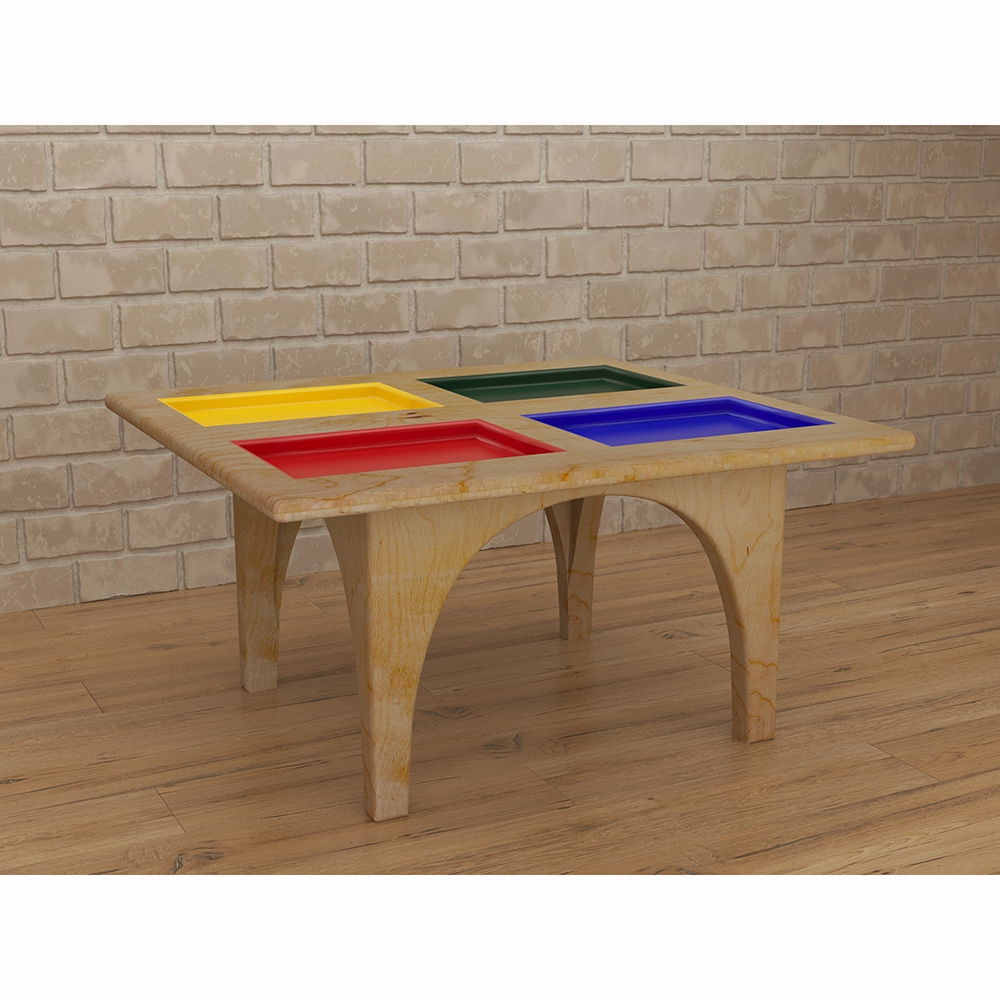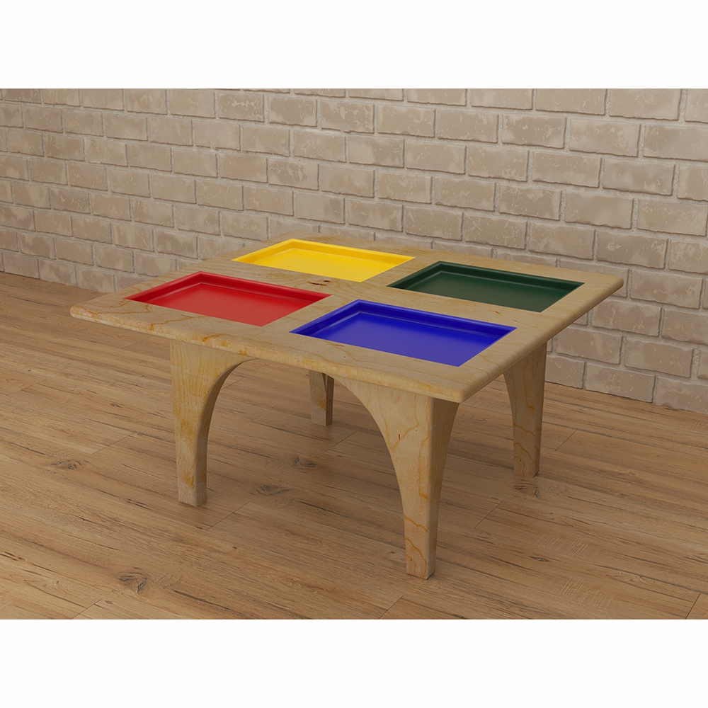 Игровой стол для занятий сенсорной интеграцией 4 цвета имеет лаконичный дизайн – основание имеет натуральный цвет древесины, а игровые пространства-углубления окрашены каждое в свой цвет (красный, жёлтый, синий и зелёный). Благодаря высокому полезному потенциалу детский игровой стол можно считать необходимым элементом оснащения пространства для занятий с детьми – его внешний вид и разнообразное применение поможет превратить обычное занятие в весёлую игру. Для чего нужно: игровой стол для занятий сенсорной интеграцией предназначен для групповых и индивидуальных занятий с детьми дошкольного и младшего школьного возраста в детских садах и центрах раннего развития.