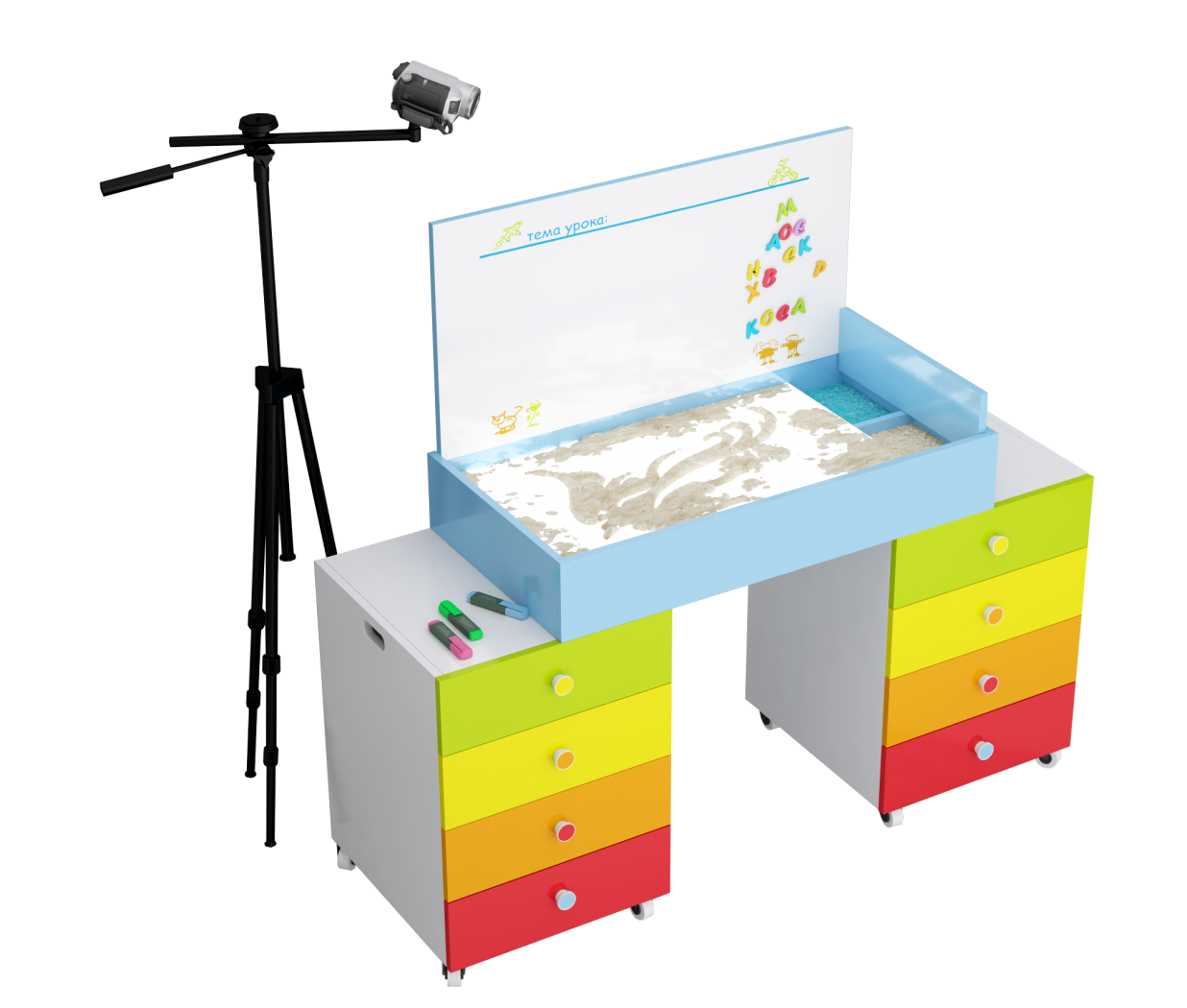 Стол воспитателя дополняет штатив с камерой, с помощью которых, изображение выводится на экран интерактивной доски или сенсорной панели. Таким образом, педагог наглядно и в реальном времени, показывает детям, что нужно делать.