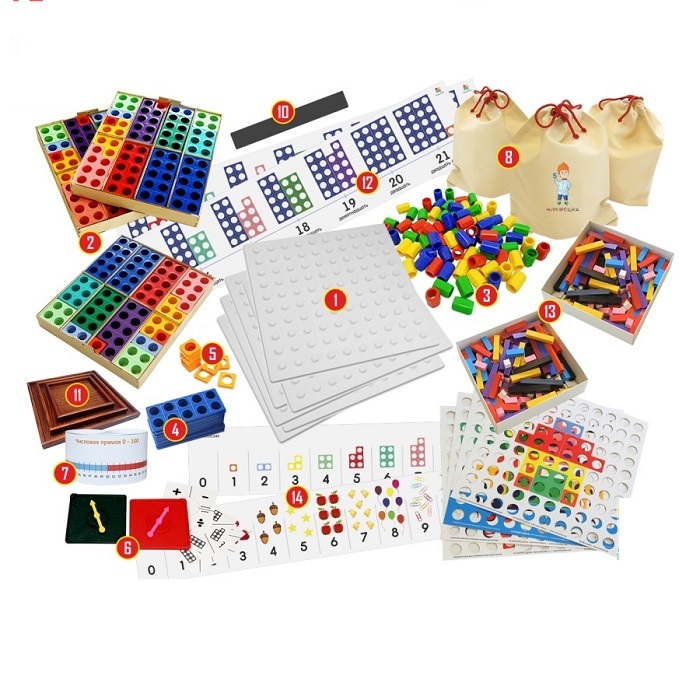 Базовый набор для групповых занятий с детьми младшего возраста от 3 до 5 лет Нумирошка – хороший выбор для детского сада или оздоровительного центра, где занятия проводятся в группе детей. Данная система поможет детям обучиться базовым математическим навыкам, а также развить усидчивость, мышление, тактильность.