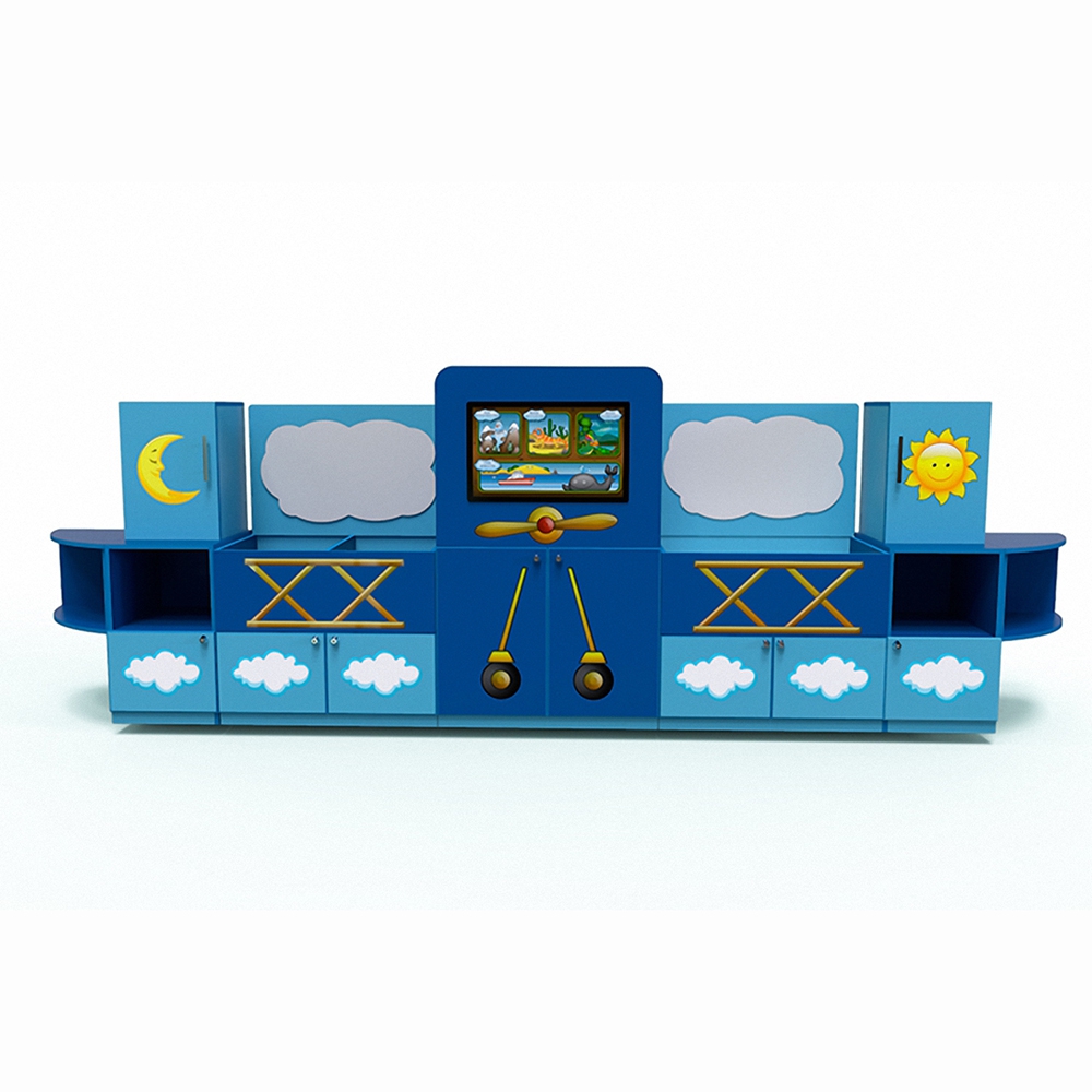 Комплекс «Логопедический Самолет» достаточно большой, размером 1516 х 3111 х 500 мм. Изготовлен из ламинированной ДСП. Оснащен: