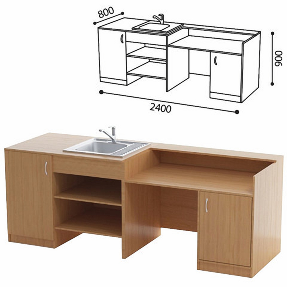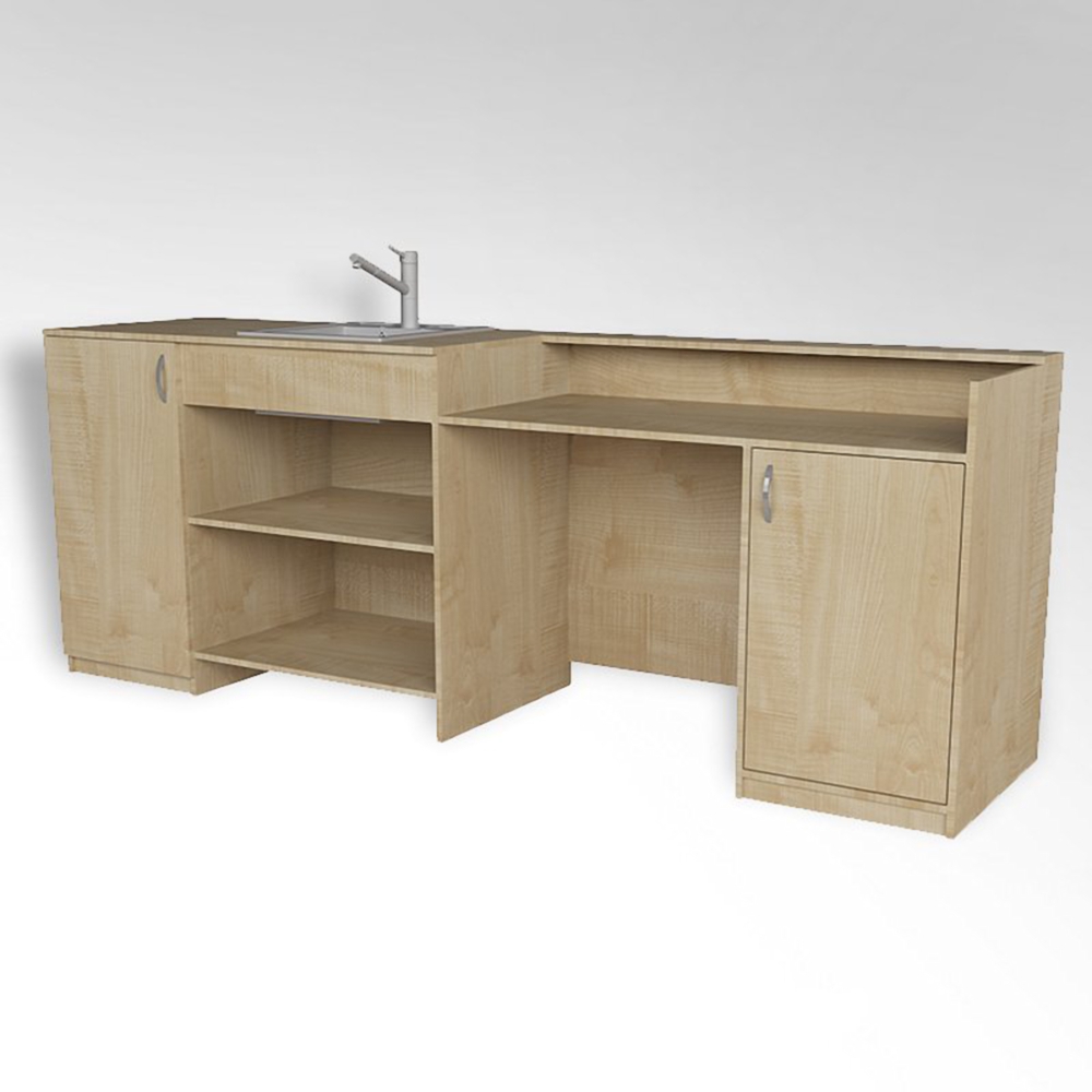 Стол предназначен для оборудования рабочего места преподавателя химии и для демонстрации химических опытов. Изготавливается из ЛДСП, оборудован металлической раковиной, полками и тумбами для реактивов, столешница покрыта пластиком стойким к воздействию химических веществ.