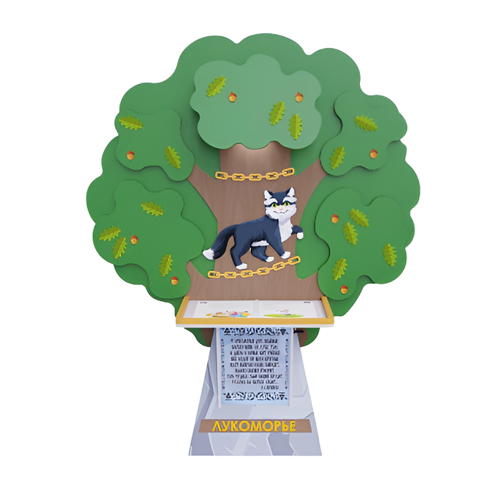 Стойка сконструирована из экологичных и гипоаллергенных материалов, гарантирует безопасность и долговечность даже в условиях интенсивного использования. Дизайн стойки выполнен в узнаваемом виде сказочного дуба, вокруг которого по цепи ходит кот. Дополнен цитатой из поэмы «Руслан и Людмила» А.С. Пушкина «У лукоморья дуб зеленый...».