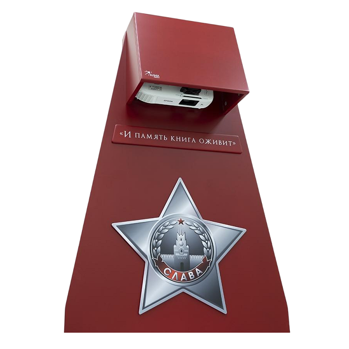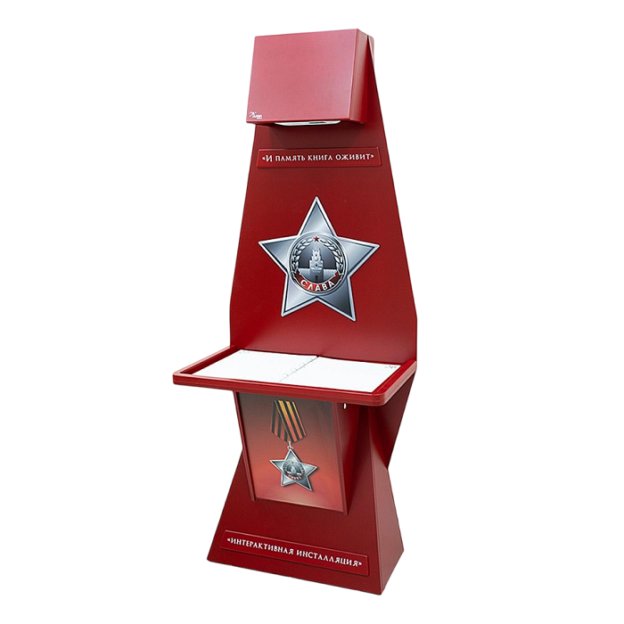 Стойка для интерактивной презентации военно-патриотического контента советской эпохи, оформленная в виде большой книги с отдельными листами, которые можно переворачивать. В верхней части стойки спрятан проектор, который выводит на листы изображение, при перелистывании книги информация на страницах меняется. Стойка идеально впишется в интерьер музея, библиотеки, школьного уголка патриотического воспитания.