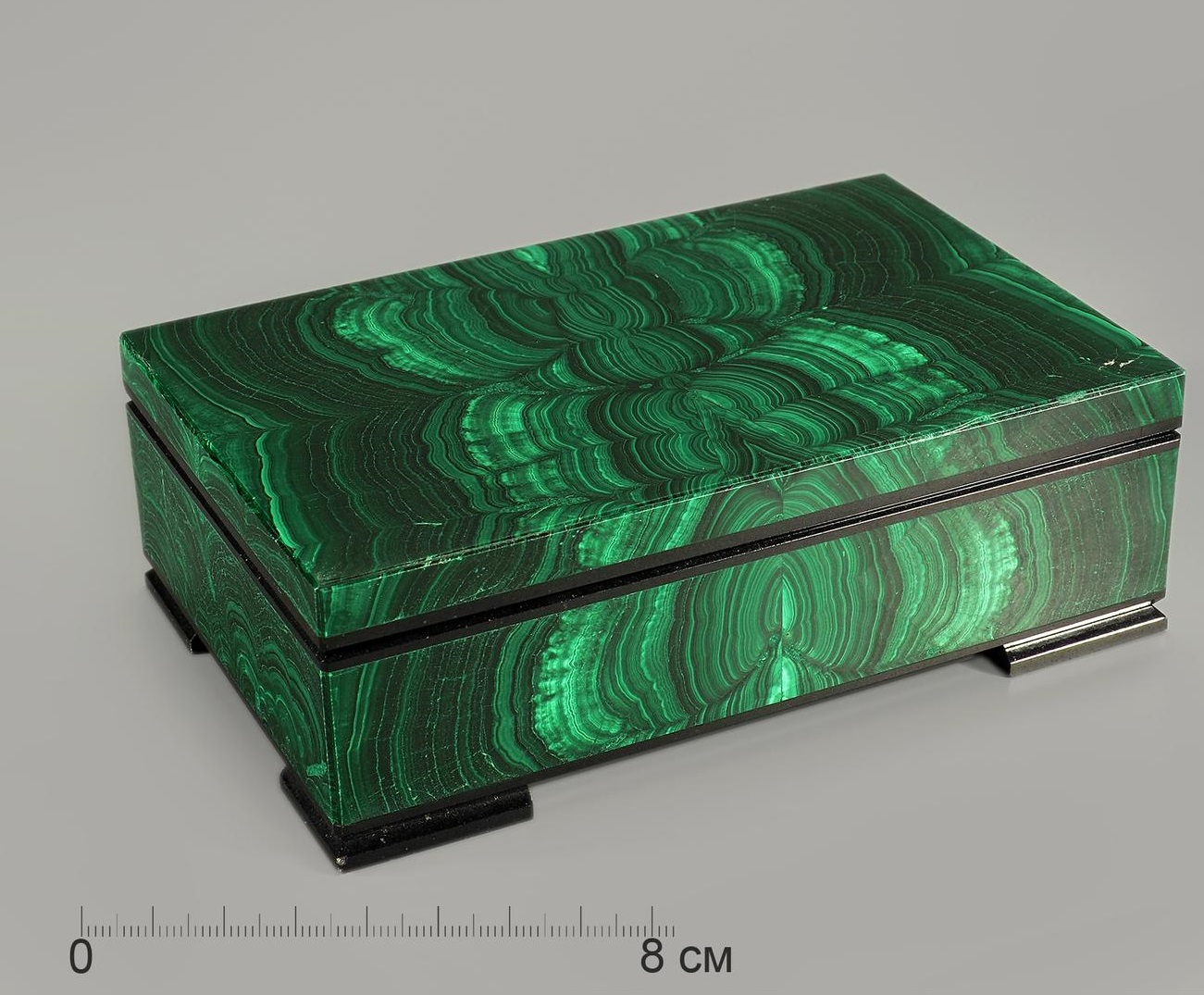 Полированная шкатулка из малахита с откидной крышкой на петлях.