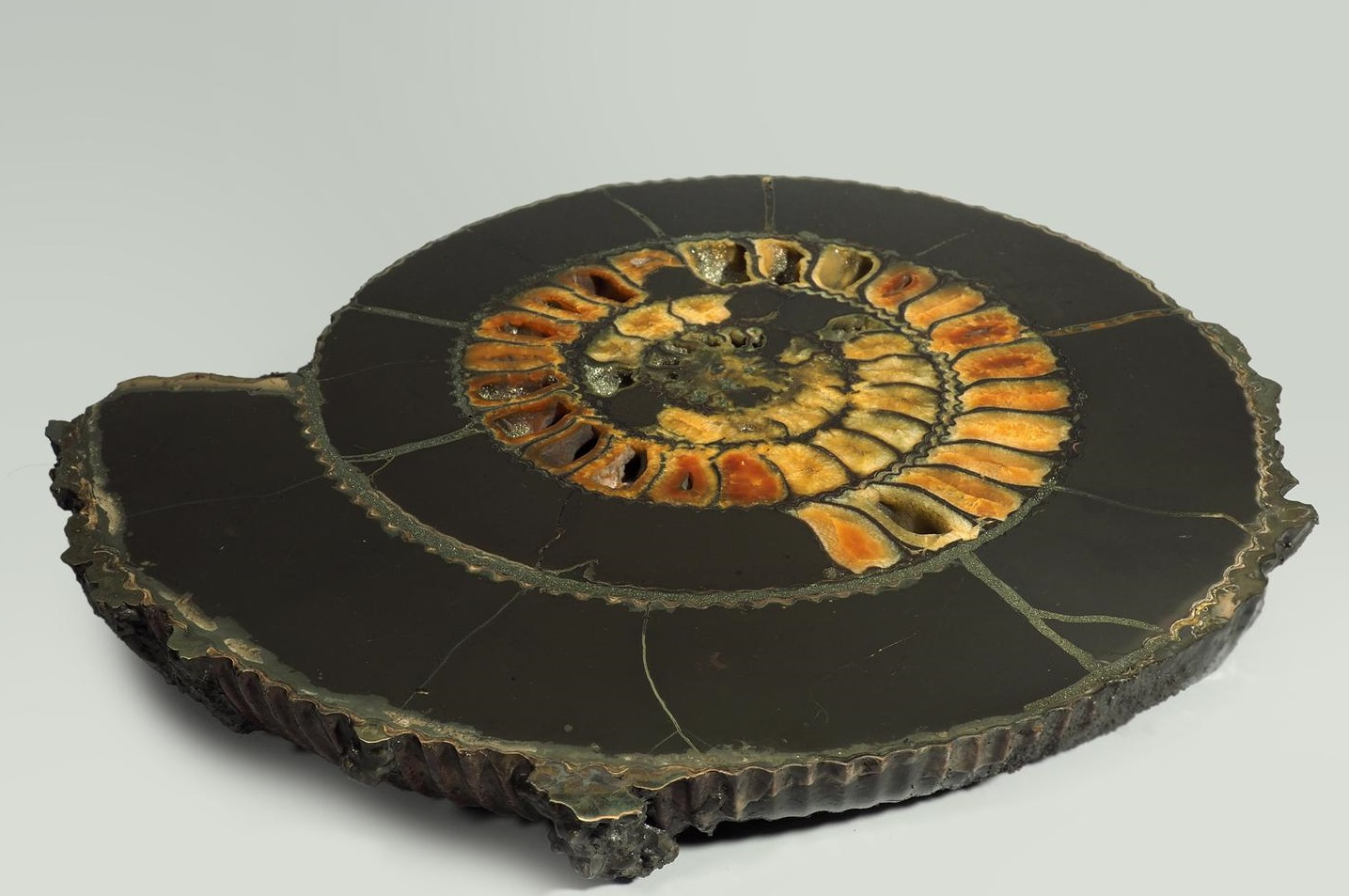 Главная Каталог Оборудование для школьного музея Оборудование для минералогического музея Образцы минералов Аммонит пиритизированный, полированный срез 31,5х28х4 см