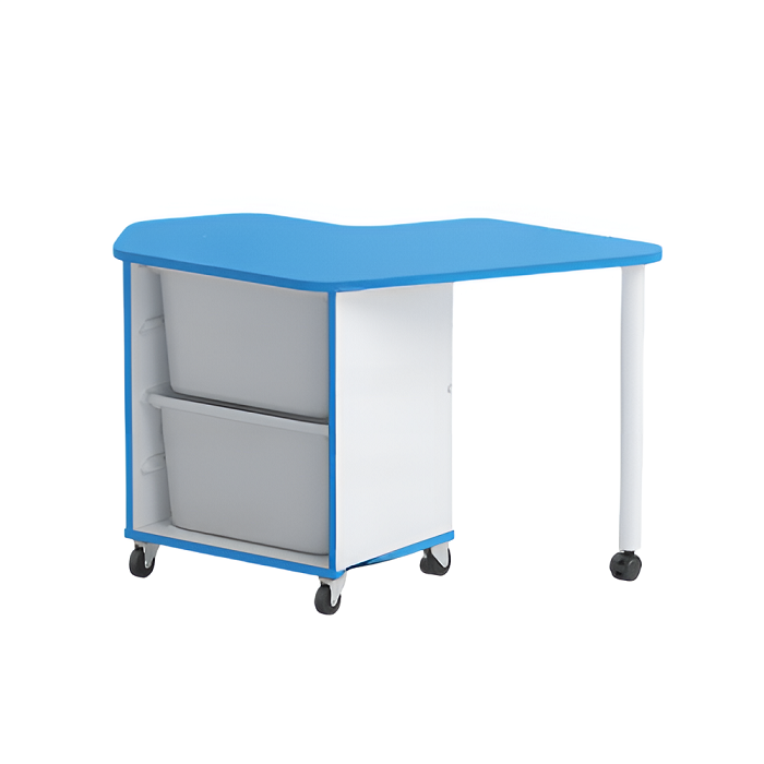 Стол детский правый Робик 002 выполнен из цветной ламинированной ДСП 16мм, кромки щитовых элементов облицованы кромочным пластиком толщиной 2 мм. Конструктивно стол выполнен в виде тумбы на колёсных опорах (две опоры с тормозом) и крышкой имеющей свес, поддерживаемый металлической опорой на колёсике. Внутри стола в открытой нише установлены два пластиковых лотка высотой по 230мм (длина лотка – 420 мм, ширина – 300 мм).