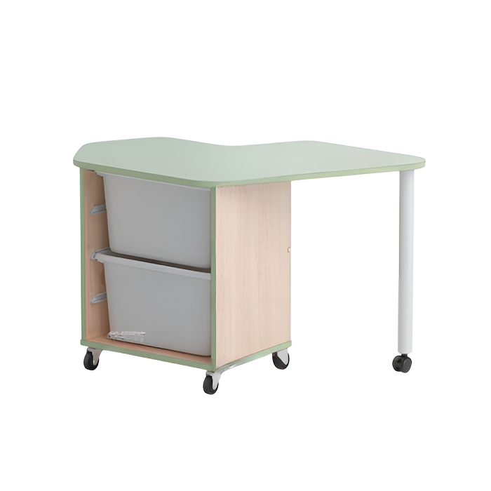 Стол детский правый Робик 002 выполнен из цветной ламинированной ДСП 16мм, кромки щитовых элементов облицованы кромочным пластиком толщиной 2 мм. Конструктивно стол выполнен в виде тумбы на колёсных опорах (две опоры с тормозом) и крышкой имеющей свес, поддерживаемый металлической опорой на колёсике. Внутри стола в открытой нише установлены два пластиковых лотка высотой по 230мм (длина лотка – 420 мм, ширина – 300 мм).