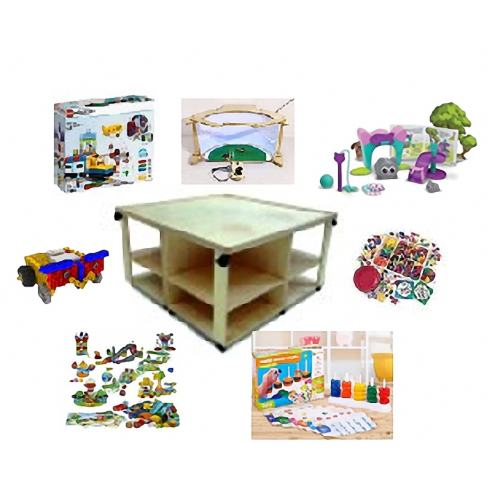 STEM набор для детей 4-5 лет. Стартовый комплект представляет собой игровую трансформируемую мобильную основу размером 1265х1265х625мм в собранном виде, которая с легкостью трансформируется в 4 индивидуальных стола размером 632х632х625 мм и отдельную столешницу, которая может служить рабочей поверхностью, размером 1365х1365мм. Игровая трансформируемая мобильная основа имеет регулируемые по высоте полки, шаг регулирования 30 мм (3 раза). Материал: ЛДСП.