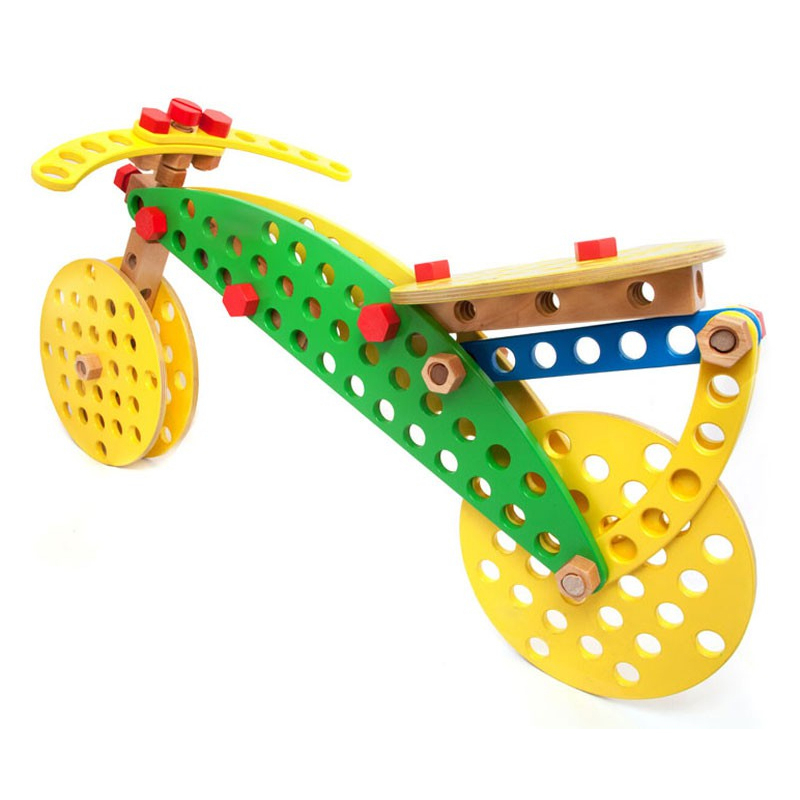 В комплекте деревянные винты и болты. Данная комплектация дает возможность собрать две модели наземного транспорта - мотоцикл и машину.