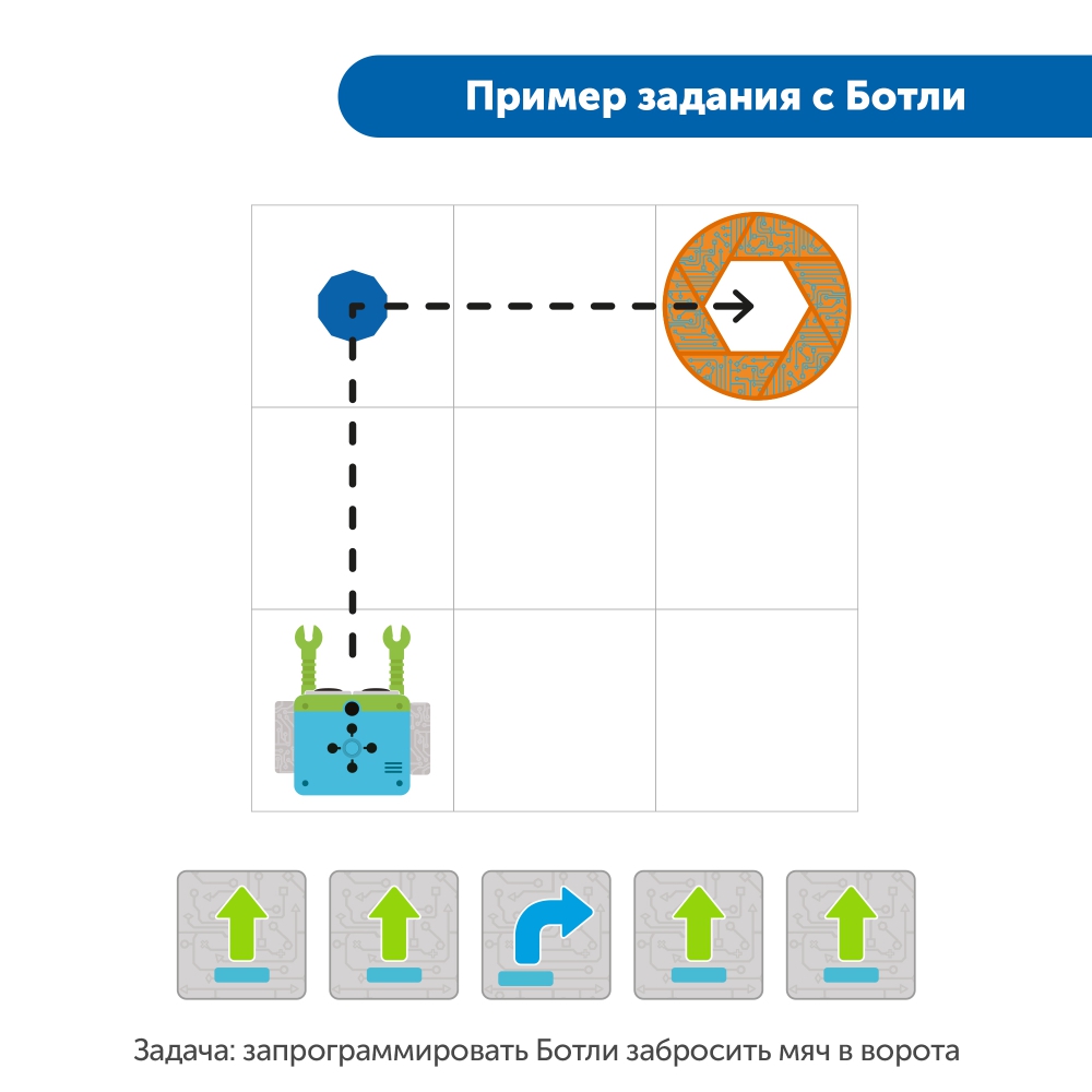 - Робот Ботли не имеет дисплея и не требует никаких дополнительных устройств для активации работы. Дети познакомятся с методом пошагового программирования и логики.