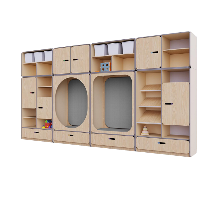 - Корпус изготовлен из экологичной березовой фанеры и ламинированной плиты. Эти материалы устойчивы к механическим воздействиям и влаге, что обеспечивает долговечность и безопасность их использования в детских учреждениях.