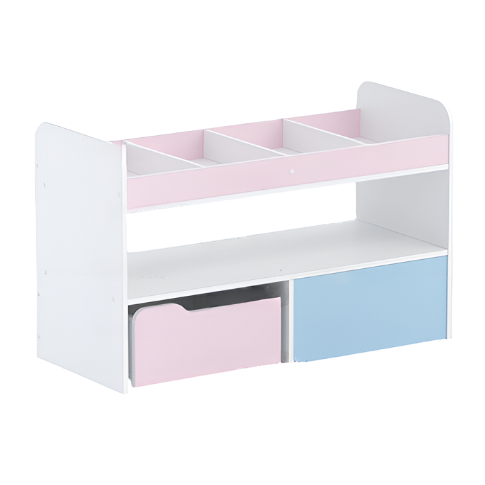 Стеллаж состоит из тумбы с жёстко скреплённой надставной секции из перегородок и двух выдвижных ящиков, которые открываются с разных сторон.