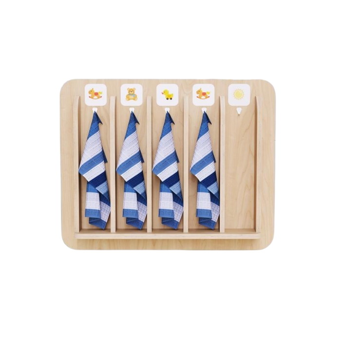 Дизайн вешалки разработан с учетом детских предпочтений и психологических особенностей, что делает её не только полезным, но и любимым предметом в группе. Вешалка оборудована специальными крючками, размещенными на удобной для детей высоте, обеспечивая легкий доступ к полотенцам.