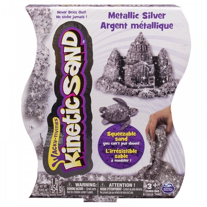 Серебряный кинетический песок, создан в коллекции металик. Это песочек серо-стального цвета, к которому добавили специальные светоотражающие частички. Благодаря чему, песок мерцает и переливается. Такой песок хорошо подойдет не только ребенку, но и взрослому для релаксации и расслабления. Смотреть на переливающийся песок очень приятно, это настоящее удовольствие для глаз и рук.