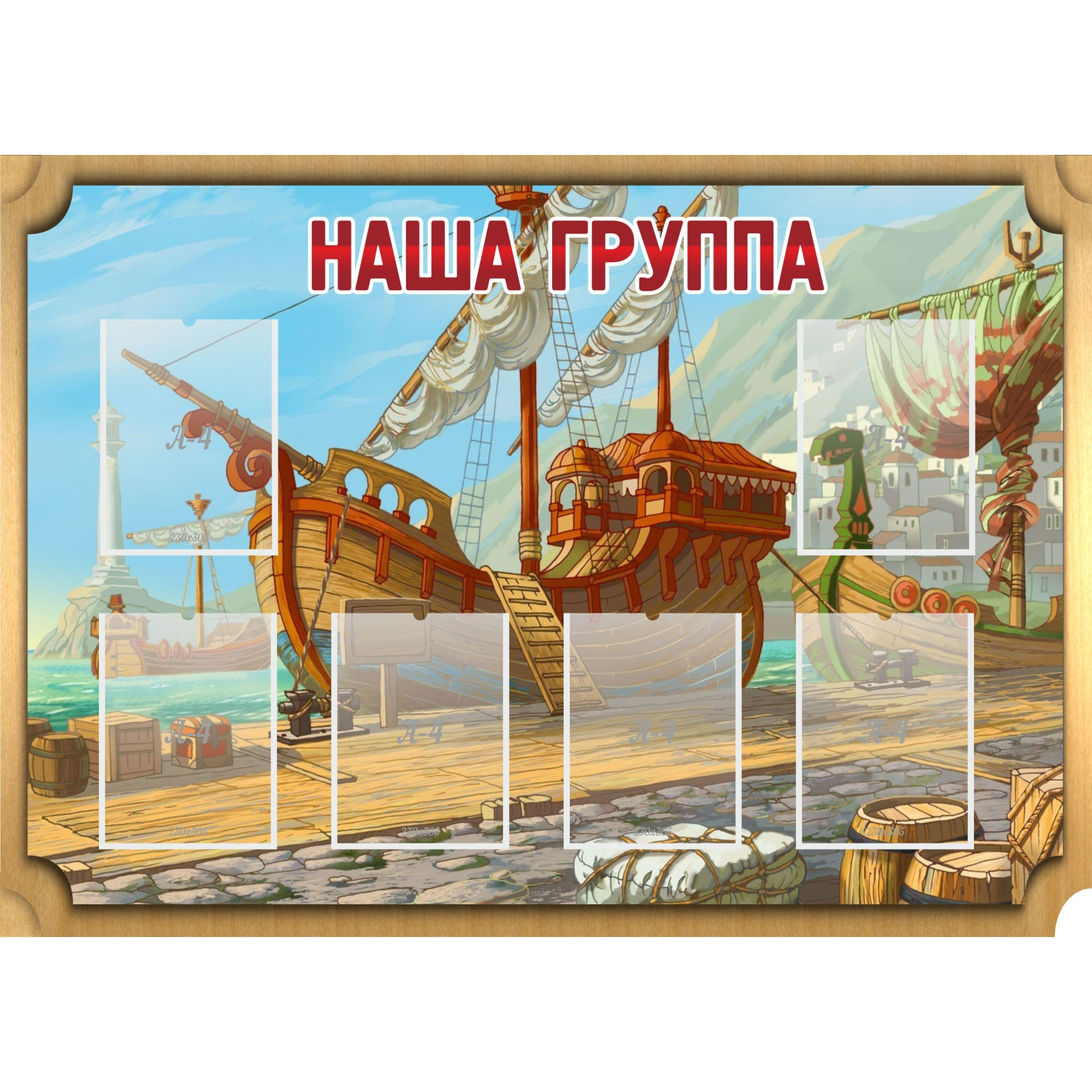 Стенд «Бригантина» придется по душе взрослым и детям из старшей группы. Основным элементом дизайна является изображение большого корабля. Мальчикам понравится высокая мачта, трап и белые паруса. Информационные карманы имеют правильное размещение, что позволяет при наполнении материалом не скрывать рисунок стенда. Стенд оформлен в строгую рамку. Удобно преподнести материал о меню группы, режиме дня, графике занятий. Менять листы можно очень часто. Это не повлияет на качество стенда. Используется уникальная технология изготовления стенда с применением материалов высокого качества.