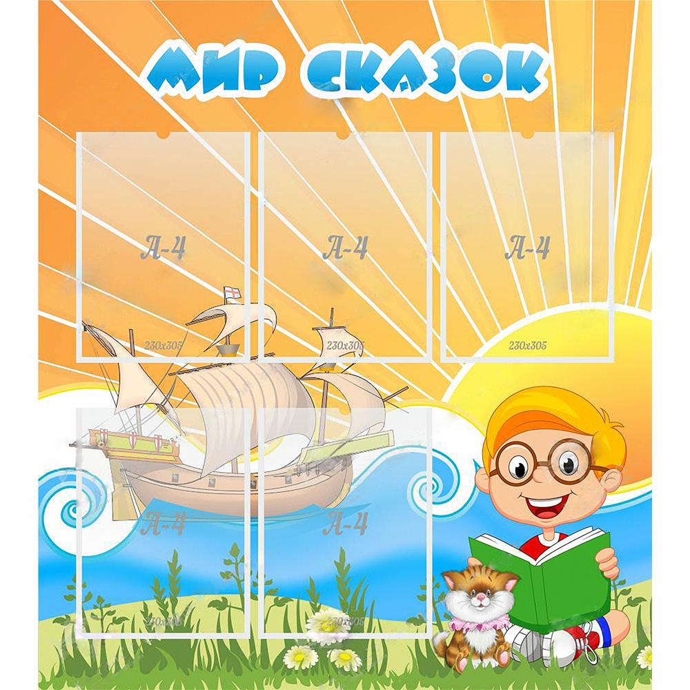 Необычный дизайн стенда привлечет внимание детей. На фоне изображено море и плывущий по волнам корабль. Яркое солнце освещает бушующее море. На берегу растет зеленая трава, в которой спрятались белые ромашки. Основная цветовая гамма стенда – оранжевая.