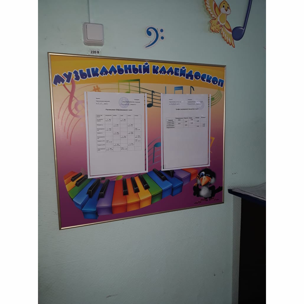 Хорошо, когда уроки музыки имеют какие-то специальные наглядные пособия. Так детям интереснее заниматься, и усваивать материал. Отличным решением для этого может стать представленный стенд, который сделан из качественного материала. Интересное внешнее оформление дарит прекрасную возможность привлечь детское внимание. Оснащен двумя карманами формата А4, в которых можно размещать слова песен, нотный стан, плакаты и объявления для малышей и их родителей. При необходимости все размещенные листы легко заменяются на новые.