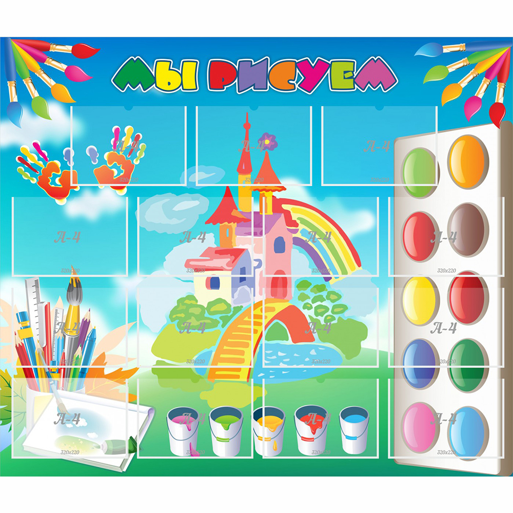 Пусть все видят, как мы рисуем, творчество нужно только поощрять, и желание делиться своими рисунками развивать! Данный стенд станет украшением вашего детского сада, особенно когда наполнится детскими рисунками!