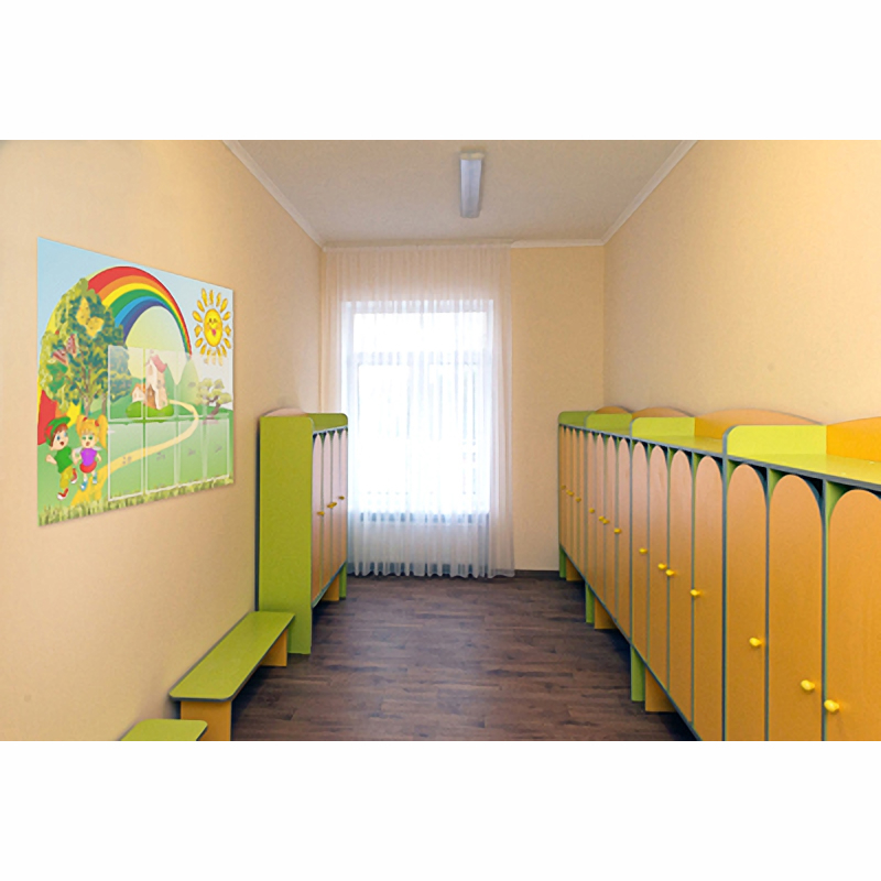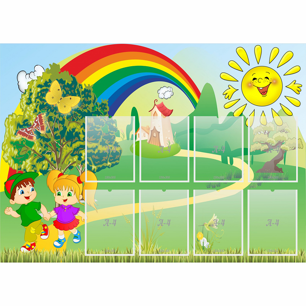 Преимуществом этого стенда является его яркий дизайн. Цветовая гамма теплая, успокаивающая. Информационные карманы размещены в два ряда. Стенд предполагает размещение любой значимой информации: списка группы, меню на день, режима дня, проводимых мероприятий в детском садике. Количество карманов предполагает размещение большого количества материала. Малышам понравится забавная картинка: озорные дети и разноцветная радуга. Теплое солнце согреет детей своими лучами и подарит им свои улыбки.