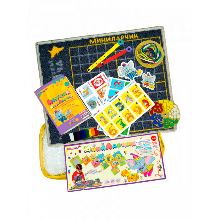 Игровой комплект «МиниЛарчик» представляет уменьшенную копию «Коврографа Ларчик» и является индивидуальным пособием для выполнения ребёнком задач разной сложности. Игровое поле может располагаться как на стене, так и на столе. Игровые элементы на обратной стороне имеют крепление "липучка".