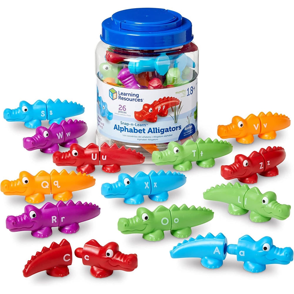 - В наборе 13 разноцветных крокодилов с буквами с обеих сторон в удобном ведерке для хранения.