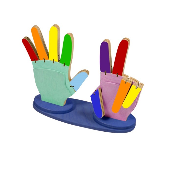 Детский игровой комплекс "Учимся считать" представляет собой яркую разноцветную настольную конструкцию в виде кистей рук человека с загибающимися пальцами.