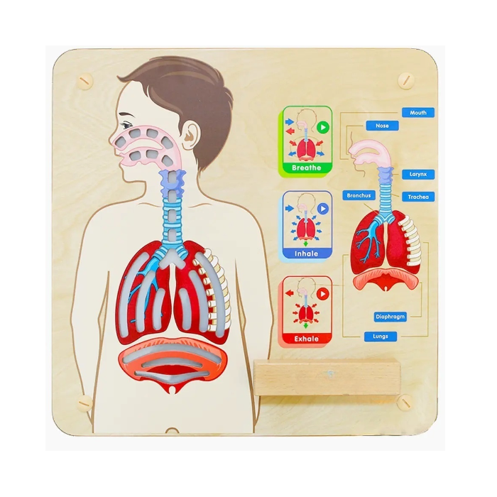 Панель для изучения работы дыхательной система и её основных органов. Когда нажата кнопка «Вдох/вдыхать», световые приборы загораются, демонстрируя процесс вдоха, диафрагма движется вниз, легкие становятся больше, а воздух попадает в легкие. Когда нажата кнопка «выдох/выдыхать» (на  анг/яз), диафрагма движется вверх, легкие становятся меньше, и из тела человека начинает выходить воздух.