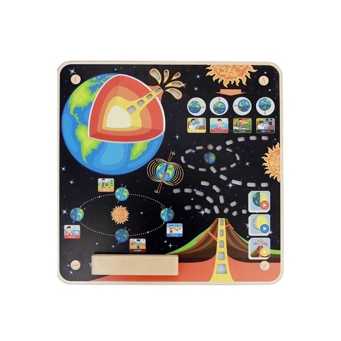 Панель знакомит детей с нашей планетой «Земля», наглядно демонстрирует, как Луна вращается вокруг Земли и как Земля вращается вокруг Солнца. Также, показывает внутреннюю структуру Земли и что происходит внутри вулкана, когда он извергается. Для лучшей демонстрации используются световые эффекты.