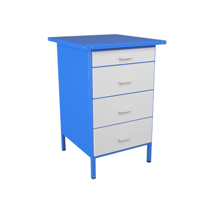 Тумба слесарная имеет цельносварную конструкцию, выполненную из профильной трубы квадратного сечения обшита листом металла толщиной 0,8 мм. Столешница состоит из влагостойкой фанеры толщиной 24 мм/ МДФ 25 мм и листа металла 1мм (возможность изменение толщины металла до 20мм). Тумба имеет 4 ящика под инструмент один малый и три больших ящика, ящики выдвигаются на полозьях, (ящики так же можно установить на шариковые направляющие). Сварная конструкция изделия свободно выдерживает ударно-маятниковые нагрузки, при работе напильниками, молотками, зубилами и ножовками по металлу. Покраска металлической тумбы полимерно-порошковая.