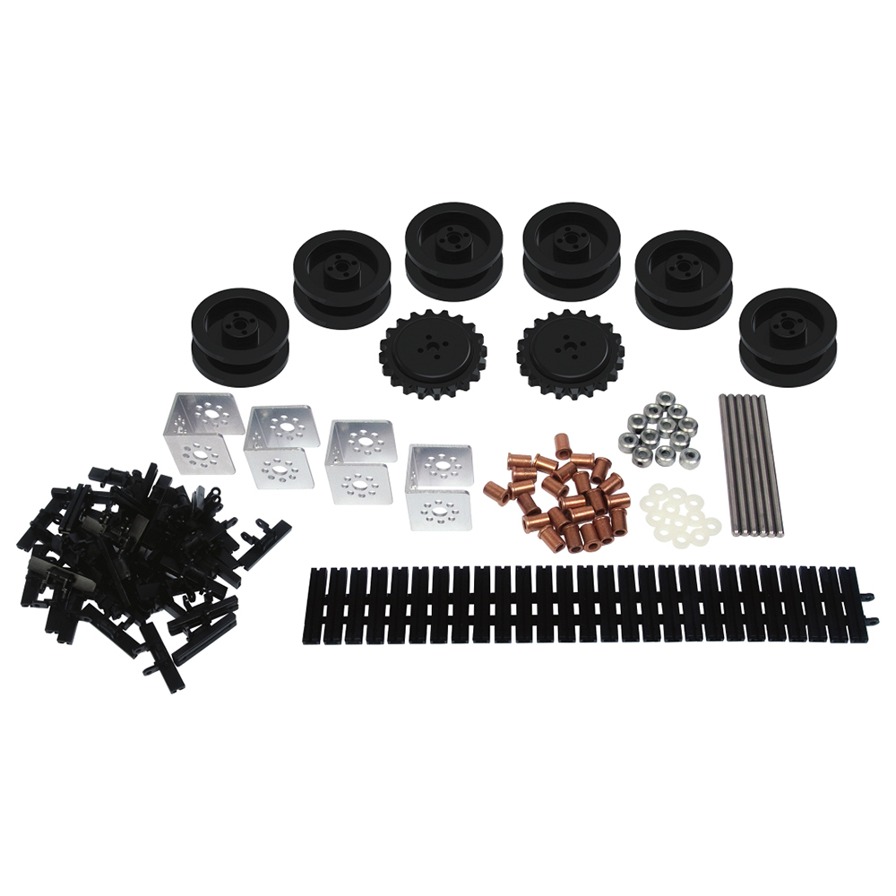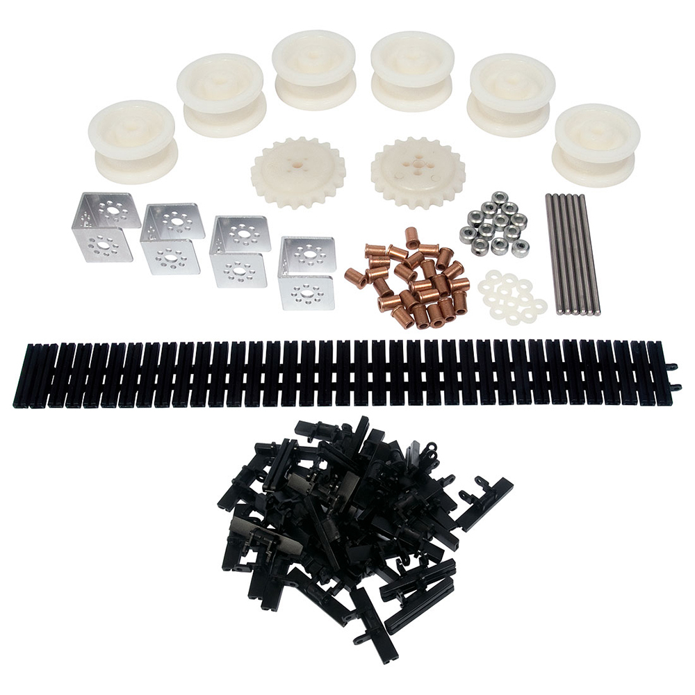 В комплекте есть всё, что нужно для создания роботов на гусеничном ходу или с ленточным конвейером.