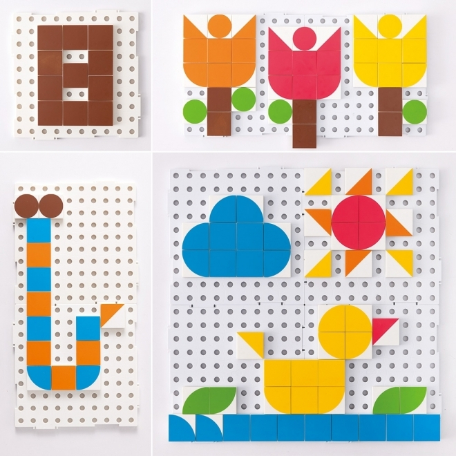 Мозаика состоит из красочных плиток с четырьмя различными графическими изображениями. Дети могут создавать различные узоры на платформе, проявляя неограниченное воображение. Это занятие помогает тренировать мелкую моторику и зрительно-моторную координацию.