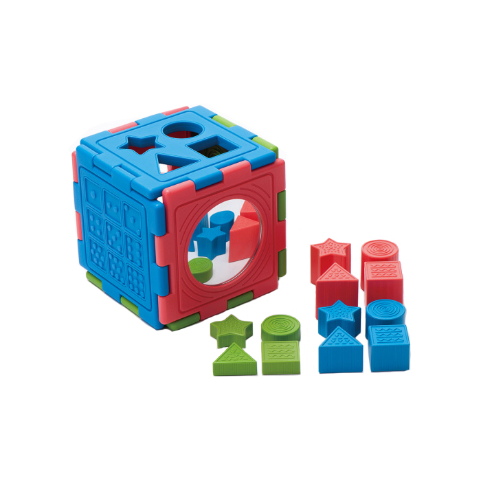 Конструктор состоит из шести различных панелей и четырех форм разноцветных блоков. Разработан с пронумерованными, пунктирными и полыми базовыми формами. Панели могут быть собраны в 2D или 3D модели. Дети изучают понятия распознавания формы, высоты и последовательности с блоками. 6 панелей можно подключить к большей игровой платформе или собрать в куб для 2D и 3D игр. 4 формы блоков (круг, треугольник, квадрат и звезда) для распознавания основных форм. Фигурные блоки 3-х цветов и 3-х высот для развития представлений о высоте и последовательности. Зеркальная панель стимулирует визуальное исследование. Пронумерованные и пунктирные панели знакомят с числовыми понятиями.