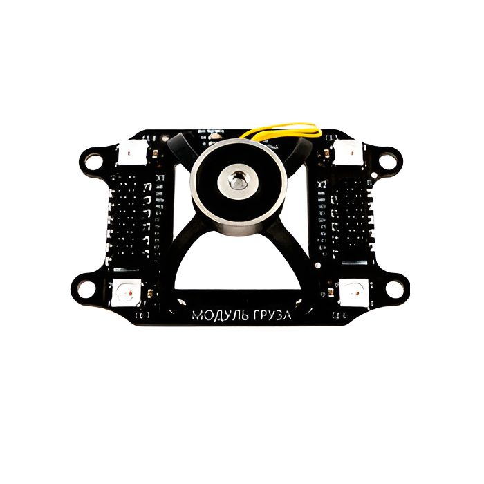 Бортовой модуль захвата груза. Модуль расширения для квадрокоптера Геоскан Пионер. Модуль позволяет квадрокоптеру подхватывать и перемещать грузы с помощью магнита. Устройство оснащено управляемым электромагнитом и четырьмя RGB-светодиодами. Программируется на Lua. Вы можете использовать его, как при полетах на радиоуправлении, так и при выполнении запрограммированных задач. Базовый коптер с установленным модулем легко поднимет грузы до 50 грамм.