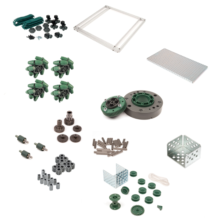 Ресурсный набор "Механика" расcчитан на увеличение функционала базовых наборов. Набор включает в себя большое количество структурных элементов (сталь, алюминий), подшипники, колёса всенаправленного действия, для реализации инженерных проектов и успешной соревновательной деятельности.
